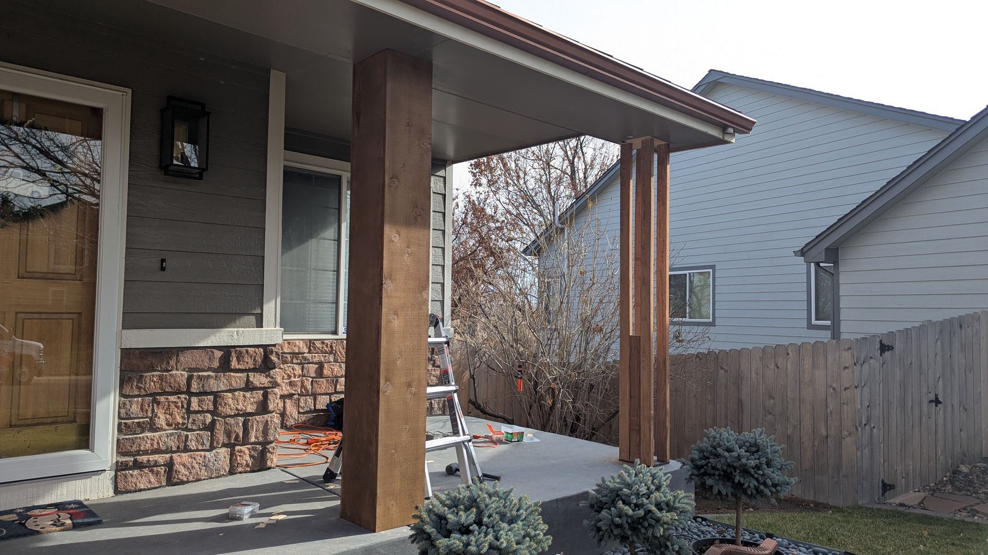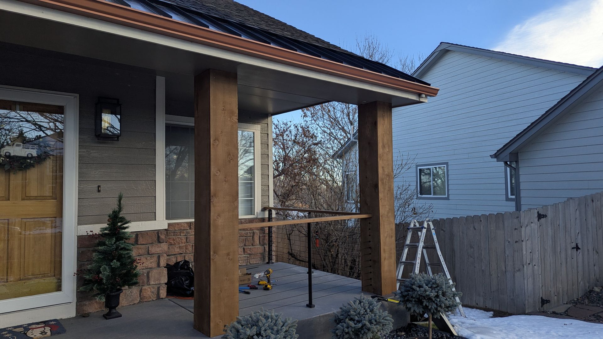 This was a fun project. This front porch was just a concrete slab. We built two columns with 2*4 framing to support the roof and covered them with 12” wide cedar planks for a nice wood finish look. I'm between the columns, we installed a railing system by cable bullet to give it a modern feel.