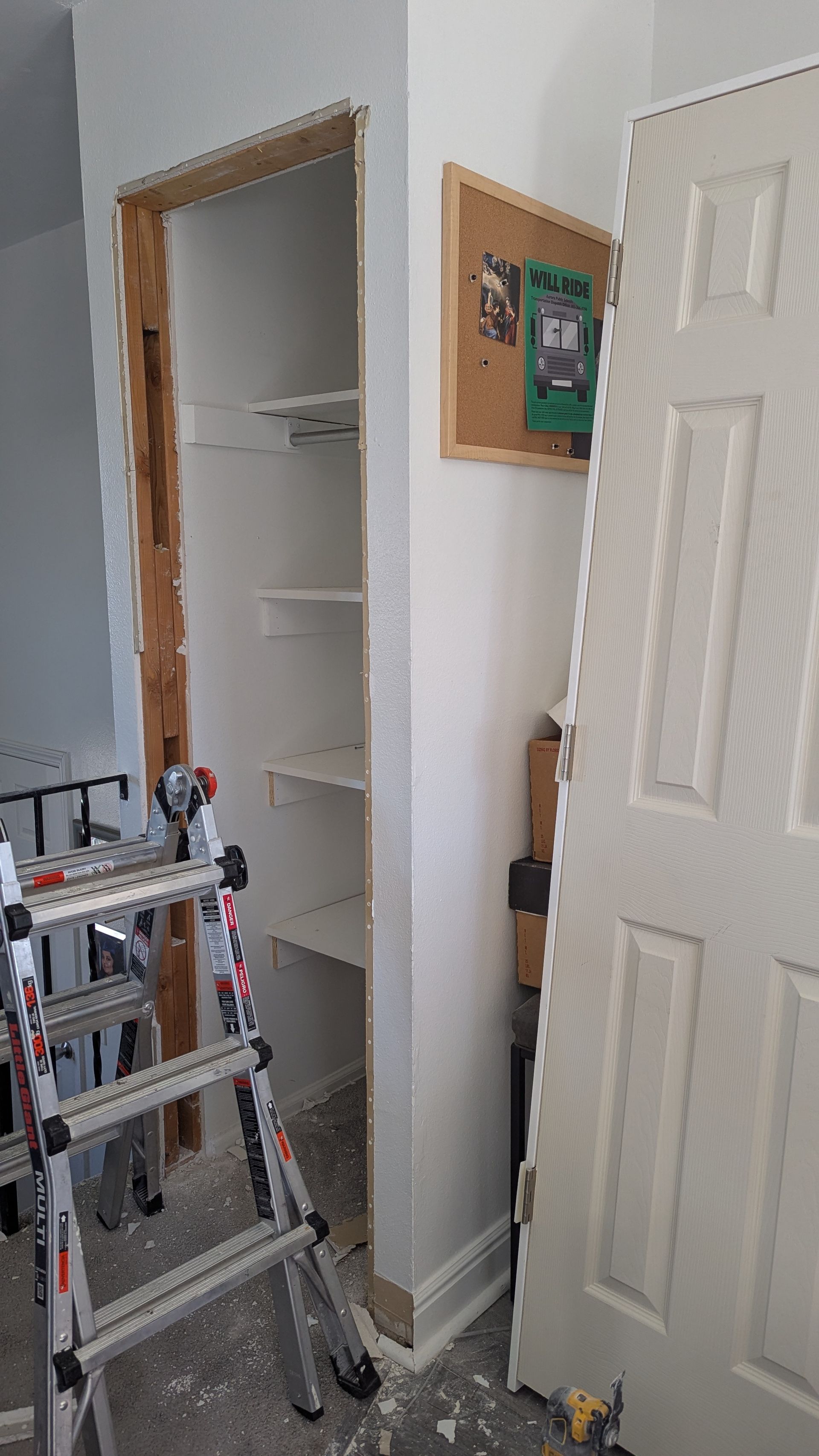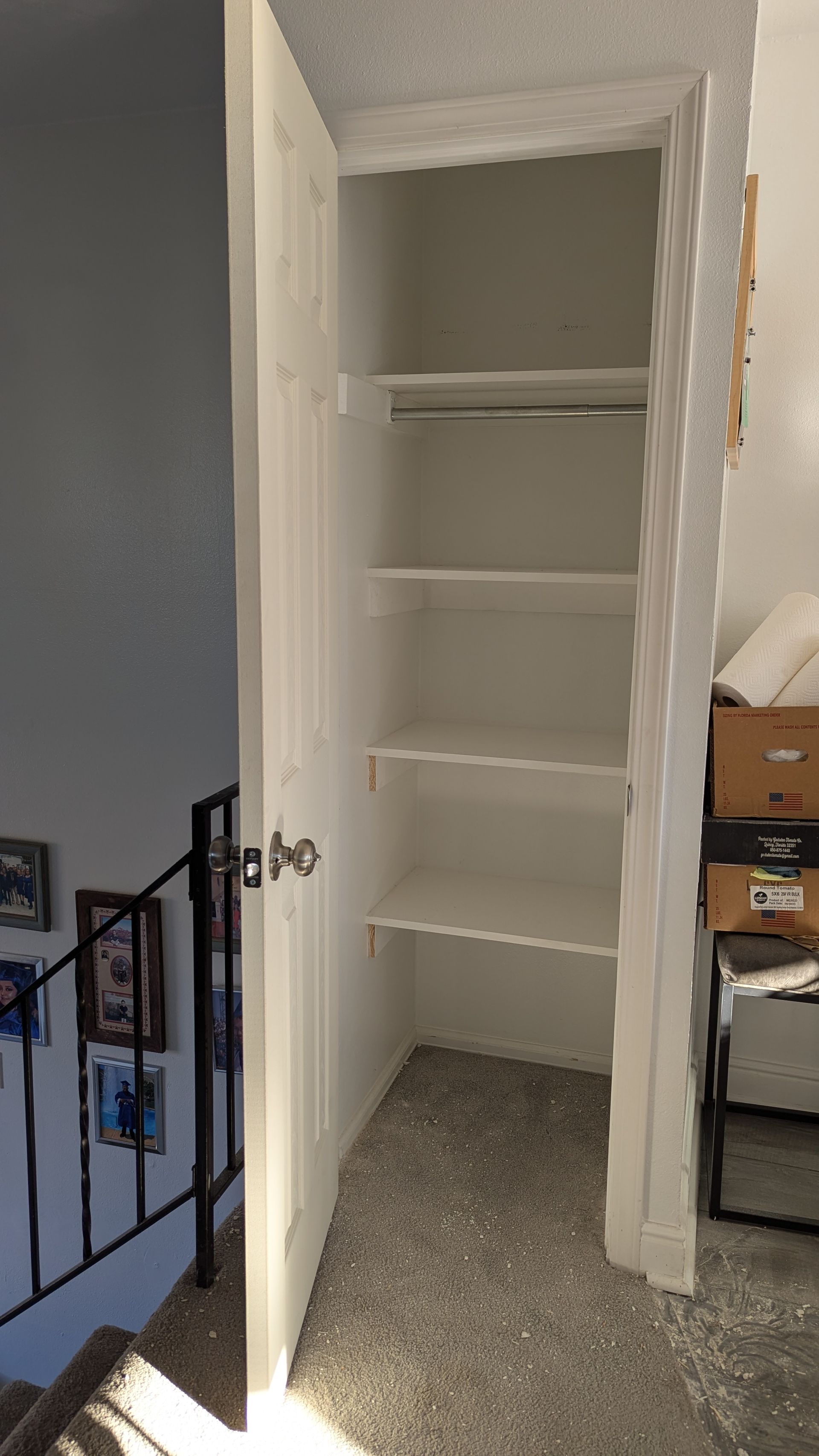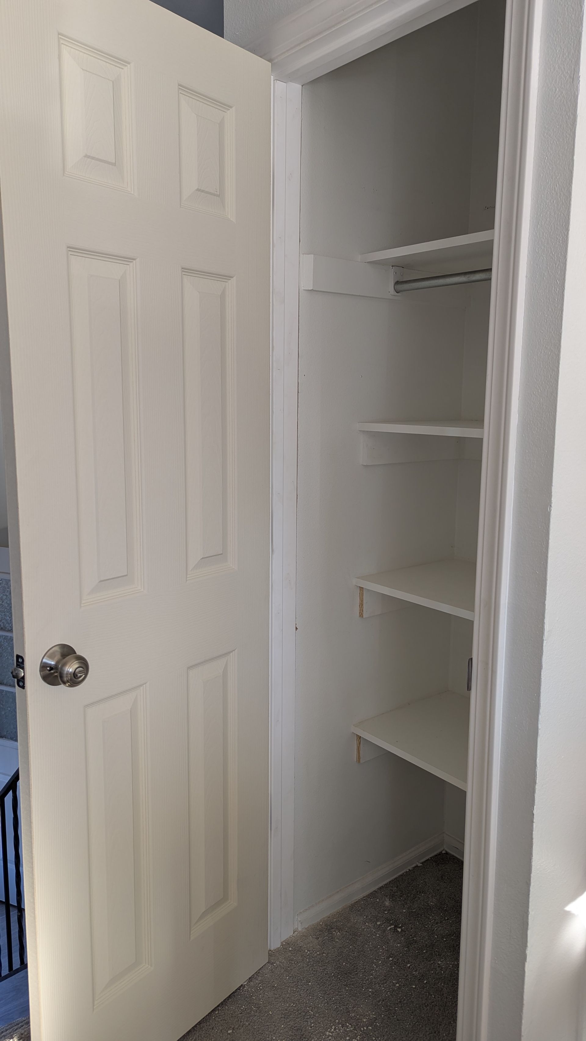 A simple pantry makeover, to provide more storage and minimize visual clutter. I installed shelves and a door.