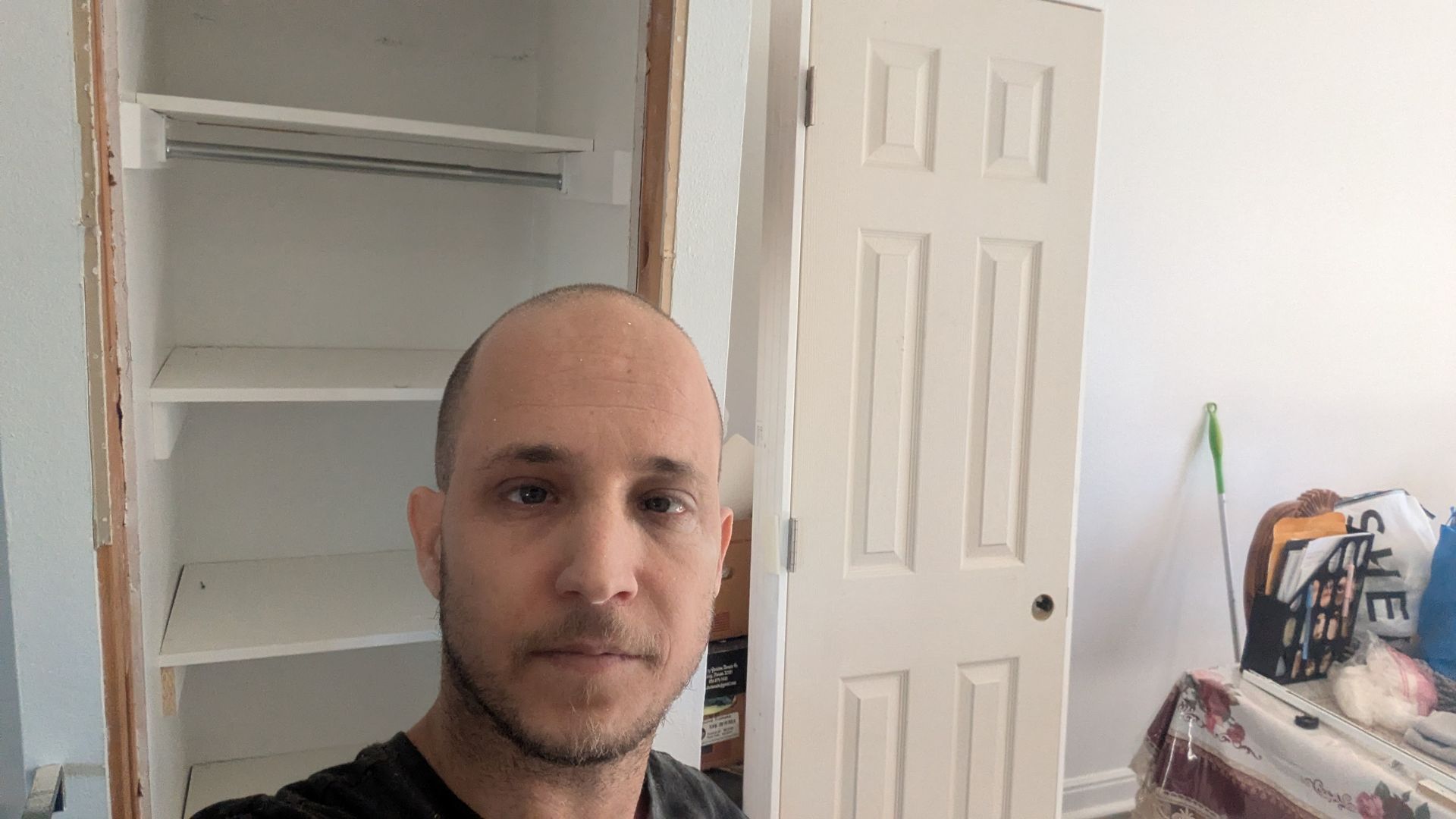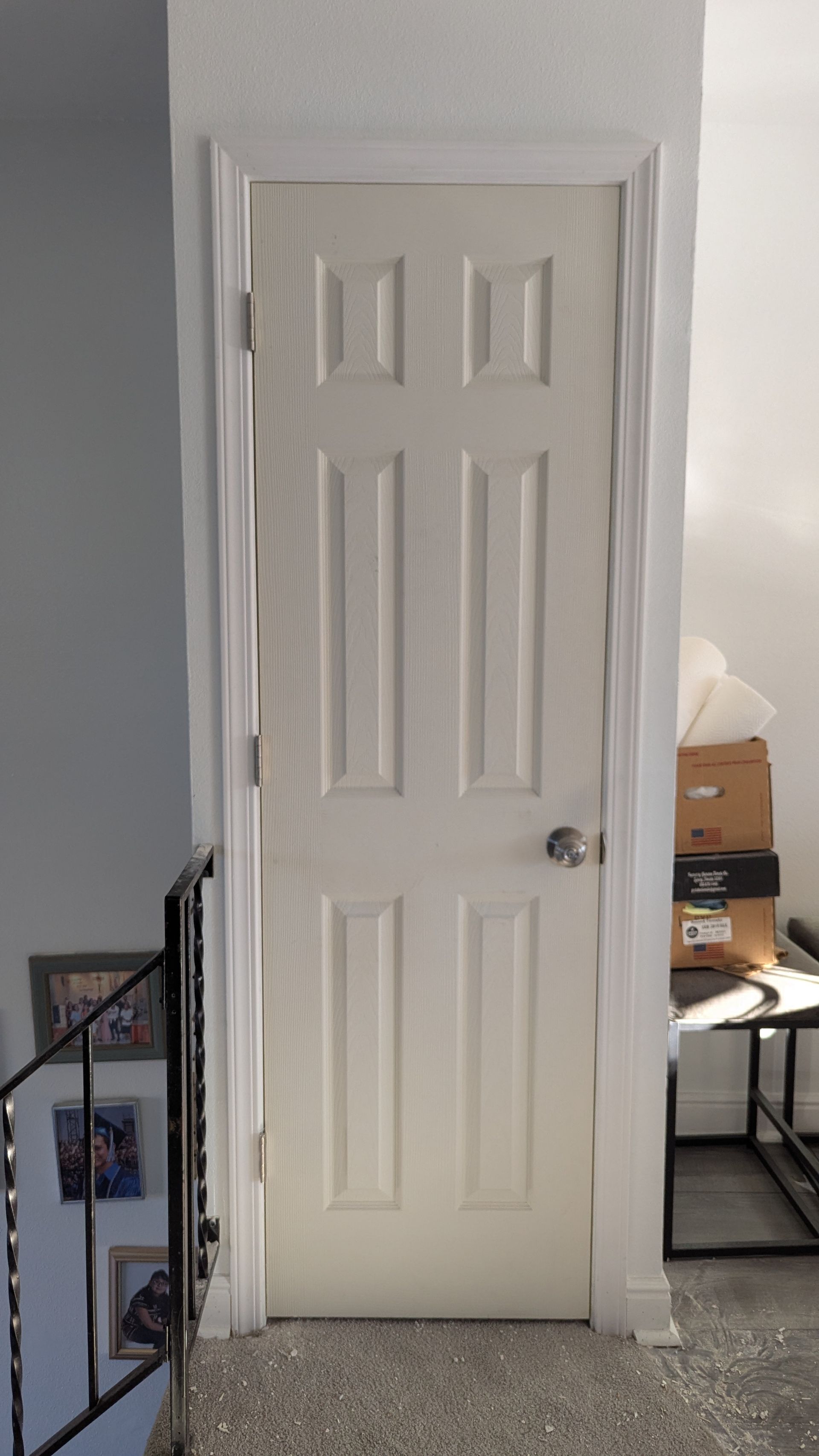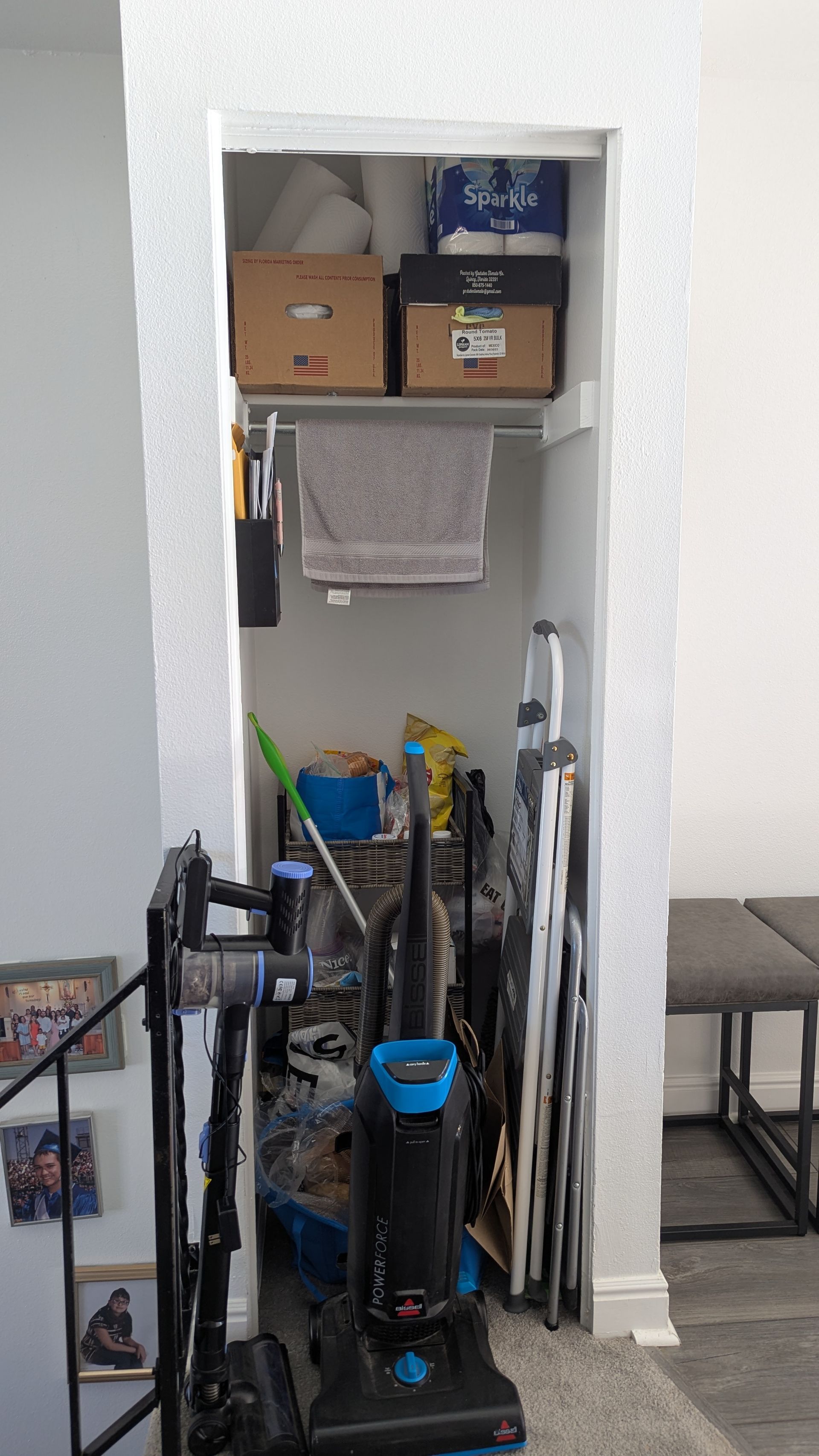 A simple pantry makeover, to provide more storage and minimize visual clutter. I installed shelves and a door.