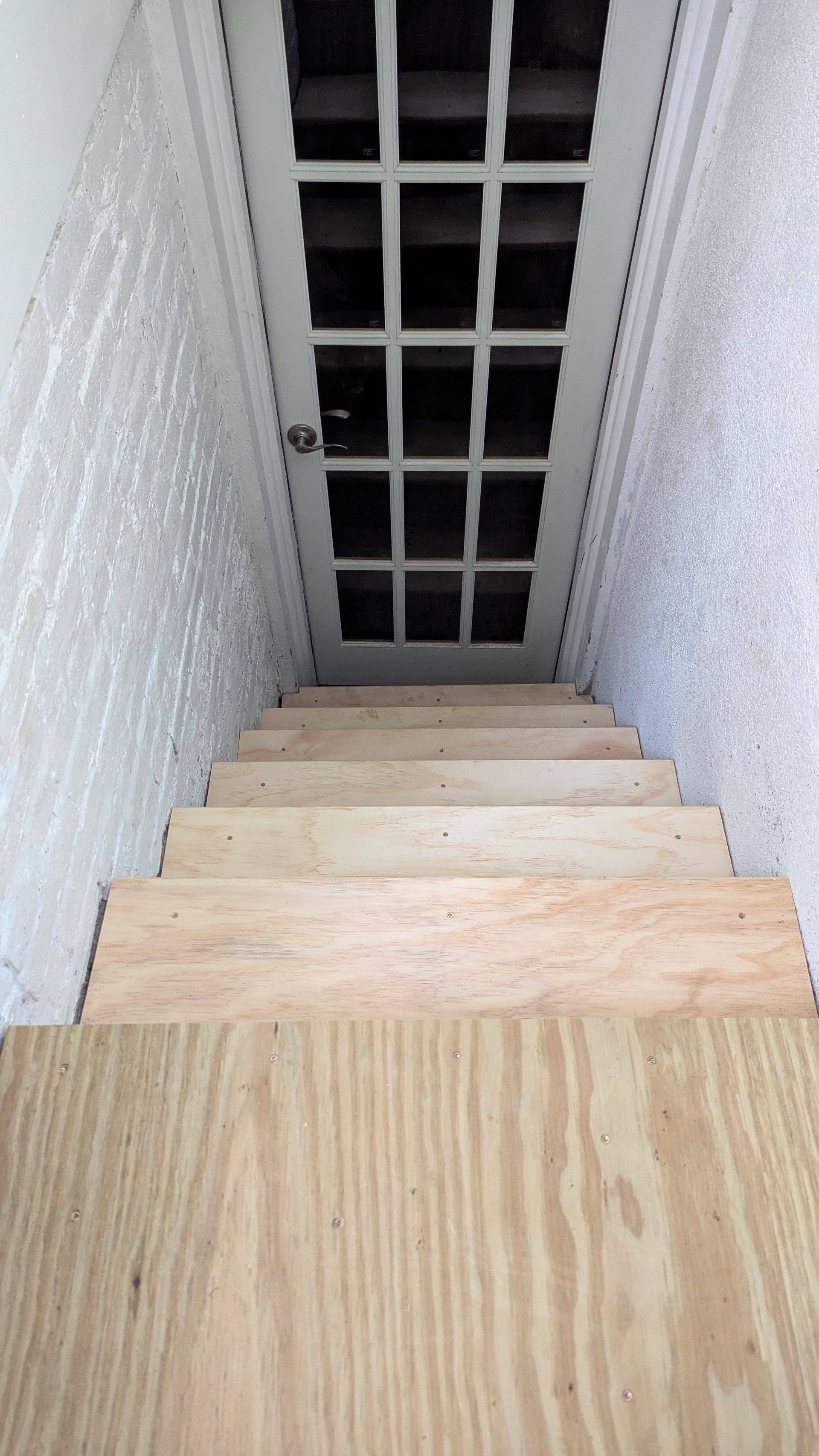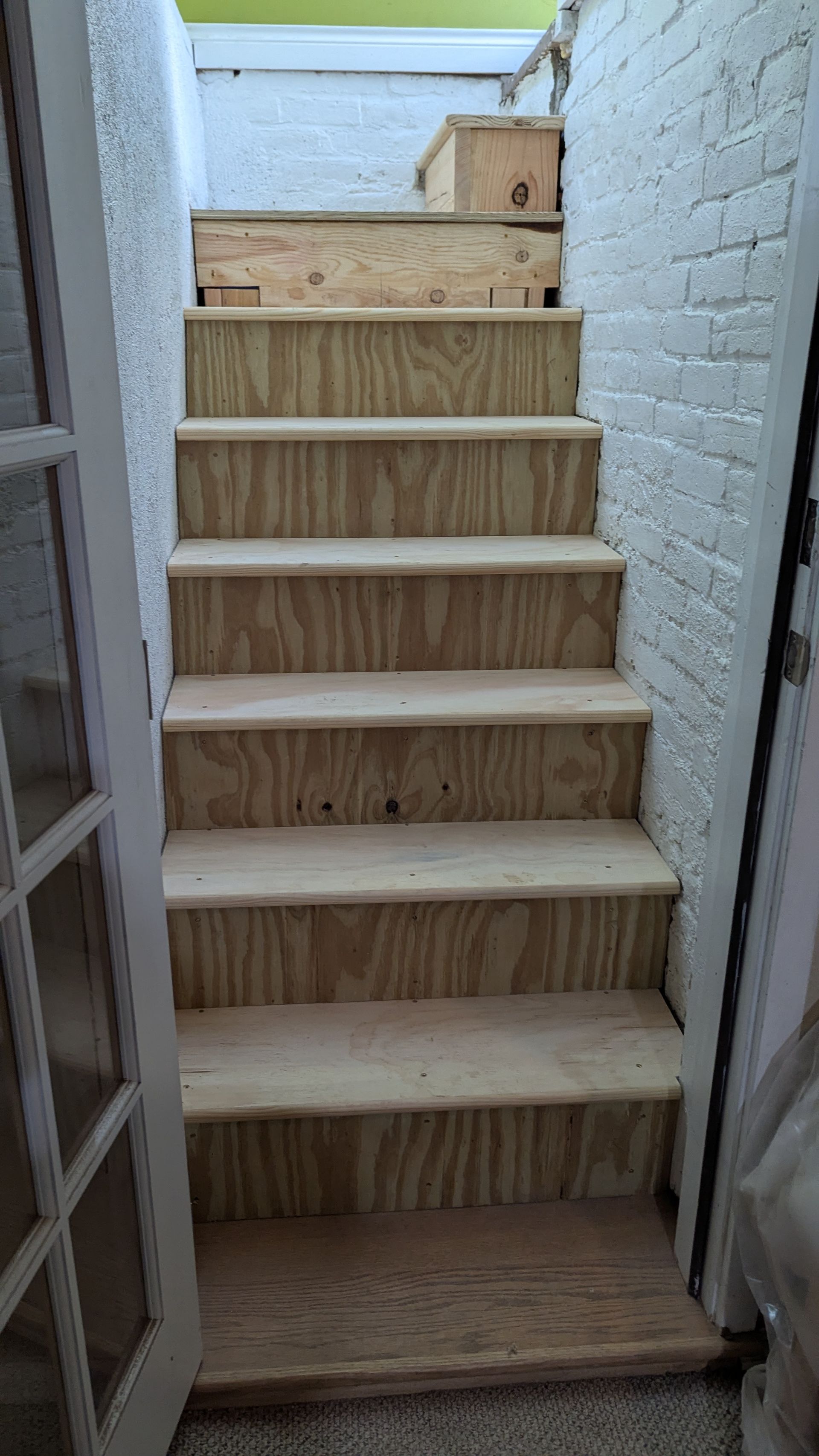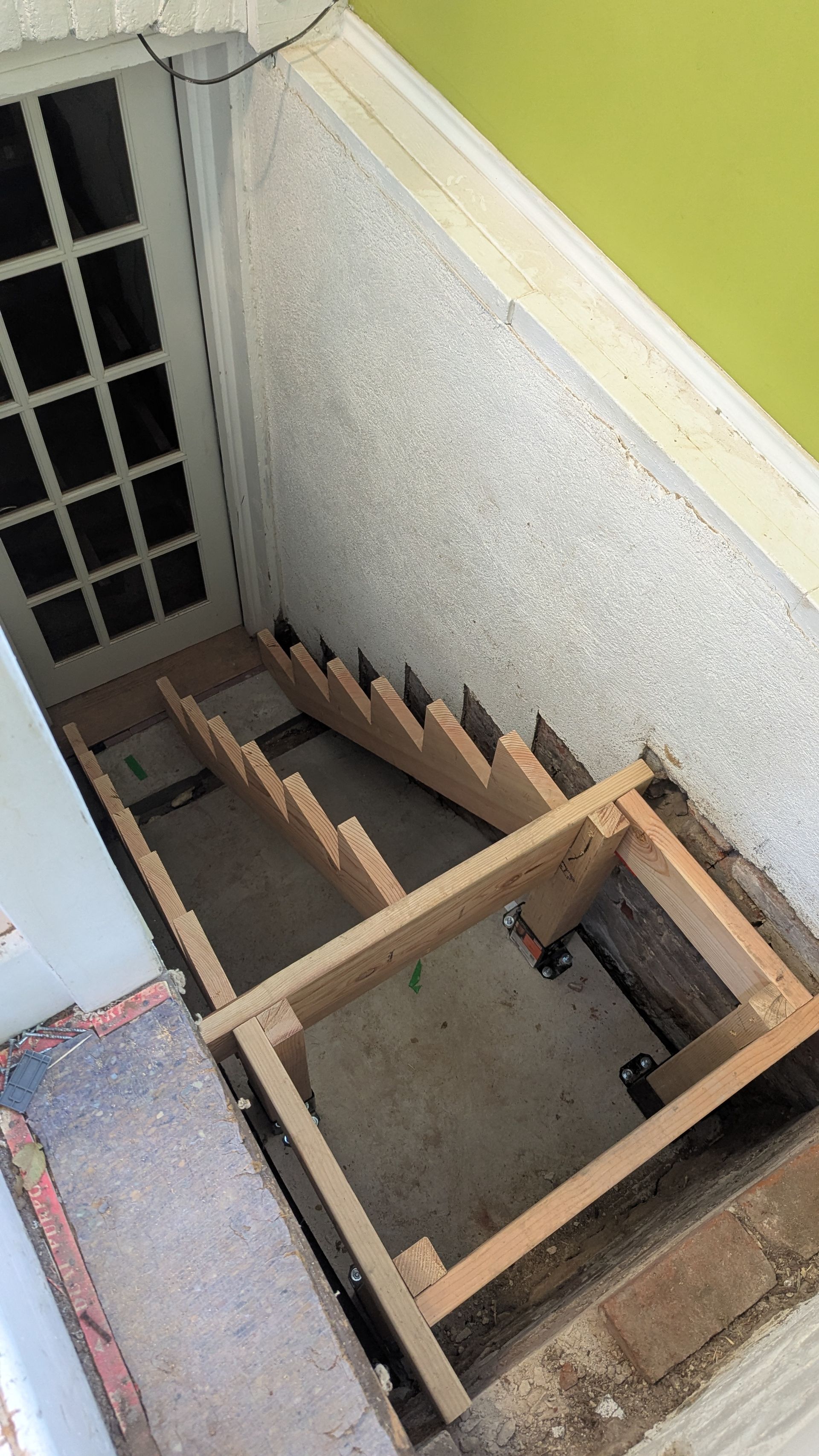 The old stairs leading to this basement were literally falling apart, it was pretty scary. We tore it all down and that's when I realized that the bricks in this old house, built in 1915, are crumbling and cannot support the new stairs. And so, instead of relying on the old bricks for support, we poured a concrete slab and created a “free standing” staircase. These stairs were later covered with a carpet.