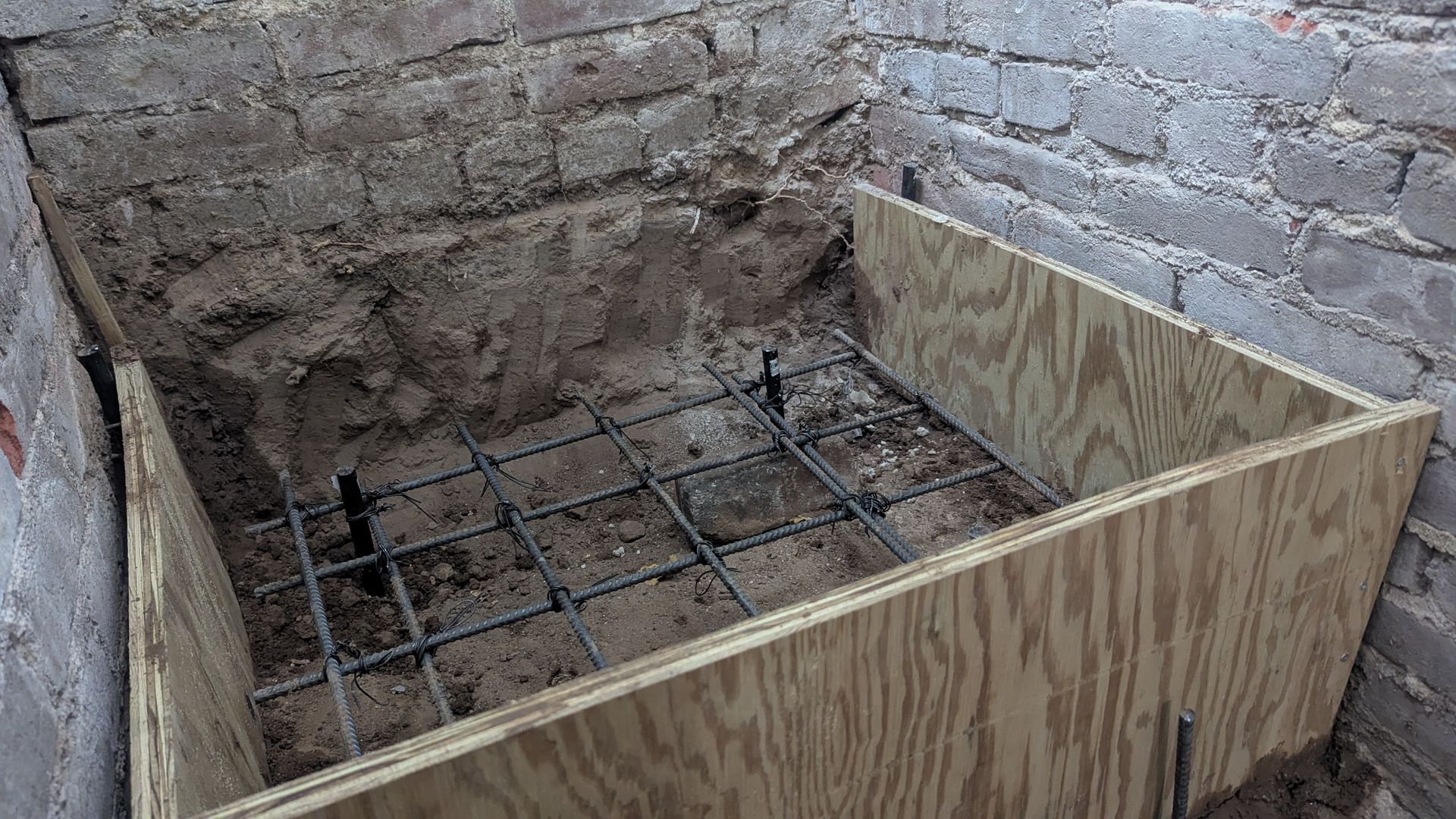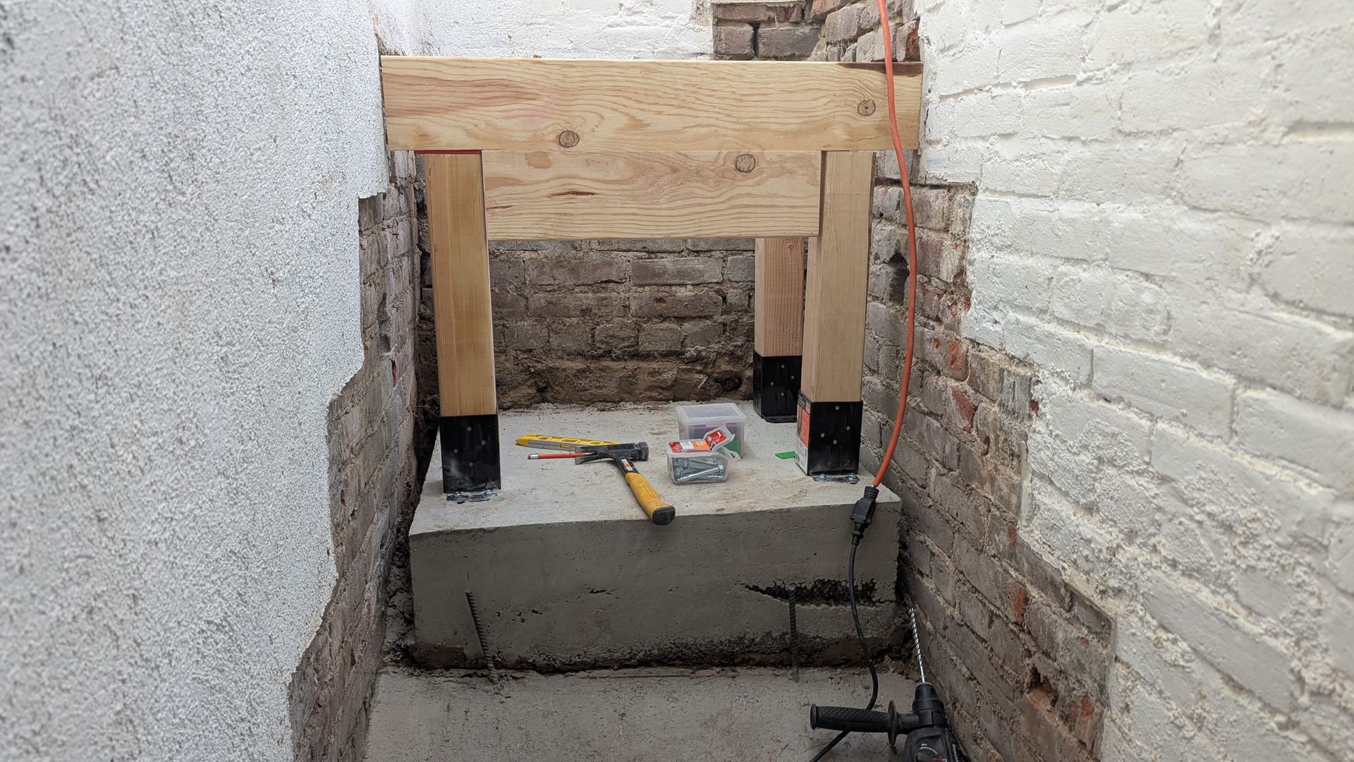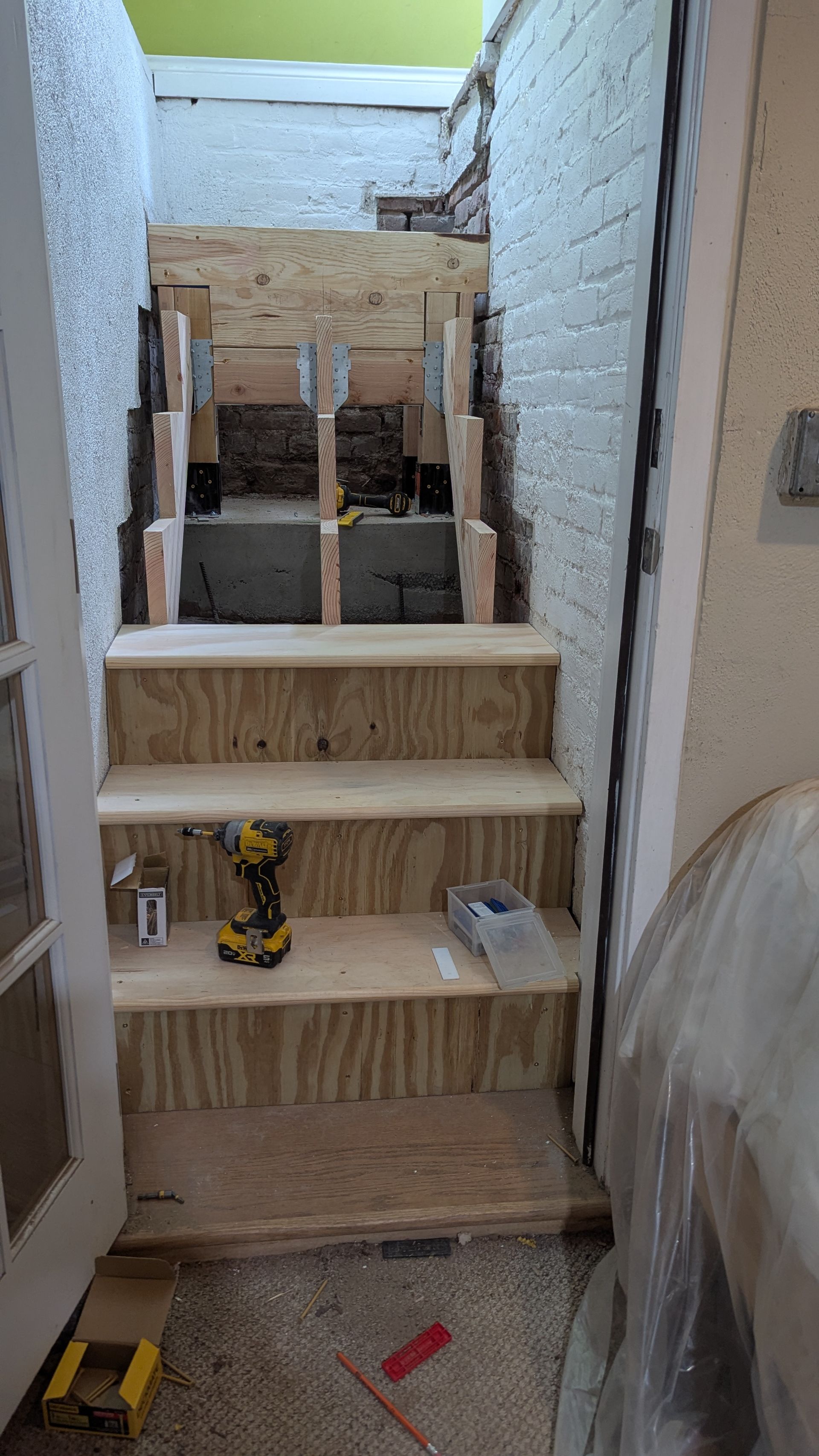 The old stairs leading to this basement were literally falling apart, it was pretty scary. We tore it all down and that's when I realized that the bricks in this old house, built in 1915, are crumbling and cannot support the new stairs. And so, instead of relying on the old bricks for support, we poured a concrete slab and created a “free standing” staircase. These stairs were later covered with a carpet.